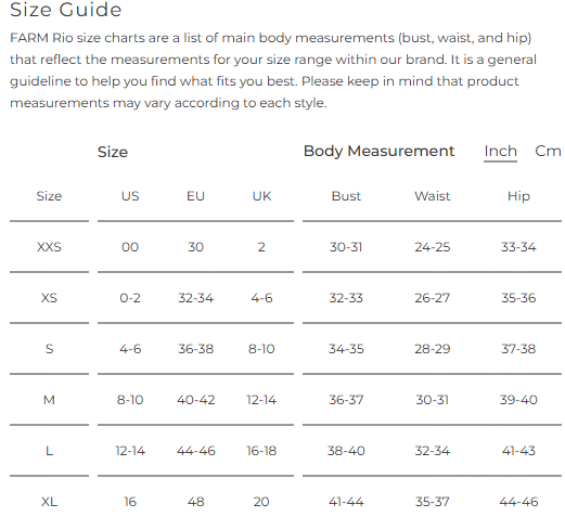 FARM Rio size charts are a list of main body measurements (bust, waist, and hip) that reflect the measurements for your size range within our brand. It is a general guideline to help you find what fits you best. Please keep in mind that product measurements may vary according to each style.